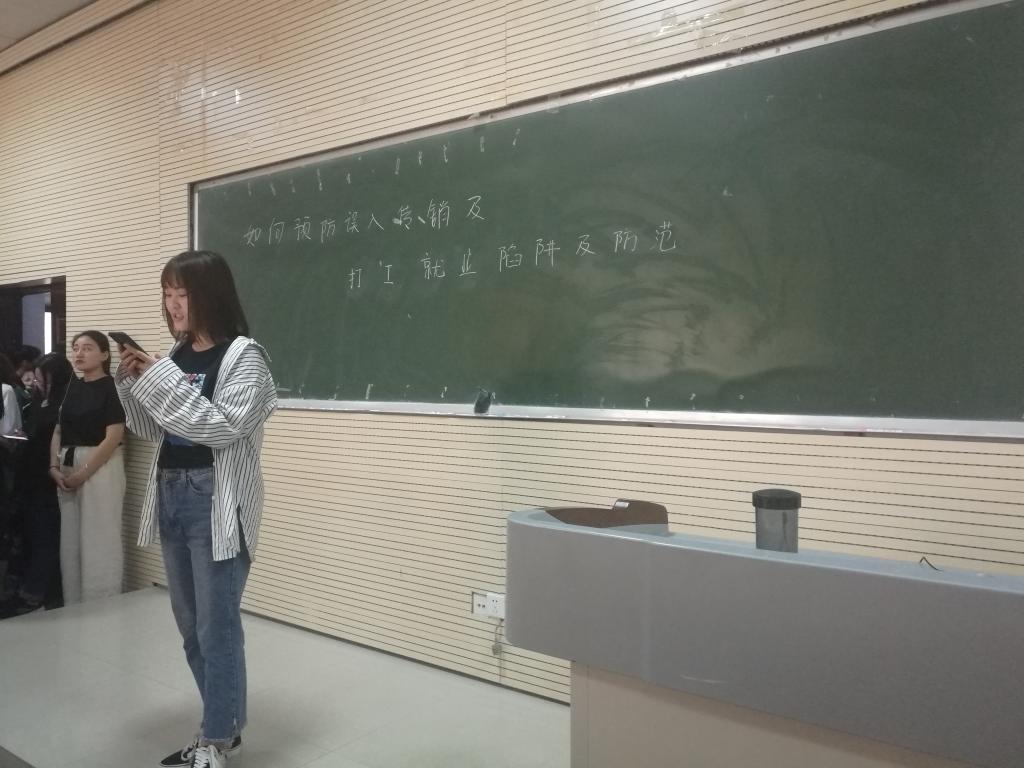 班会分为“如何预防误入传销”和“打工就业陷阱及防范”两个内容进行,由辅导员主持班会。首先是班委上台宣读如何识别传销的方法和如何预防就业陷阱及防范的方法,之后同学们展开讨论。