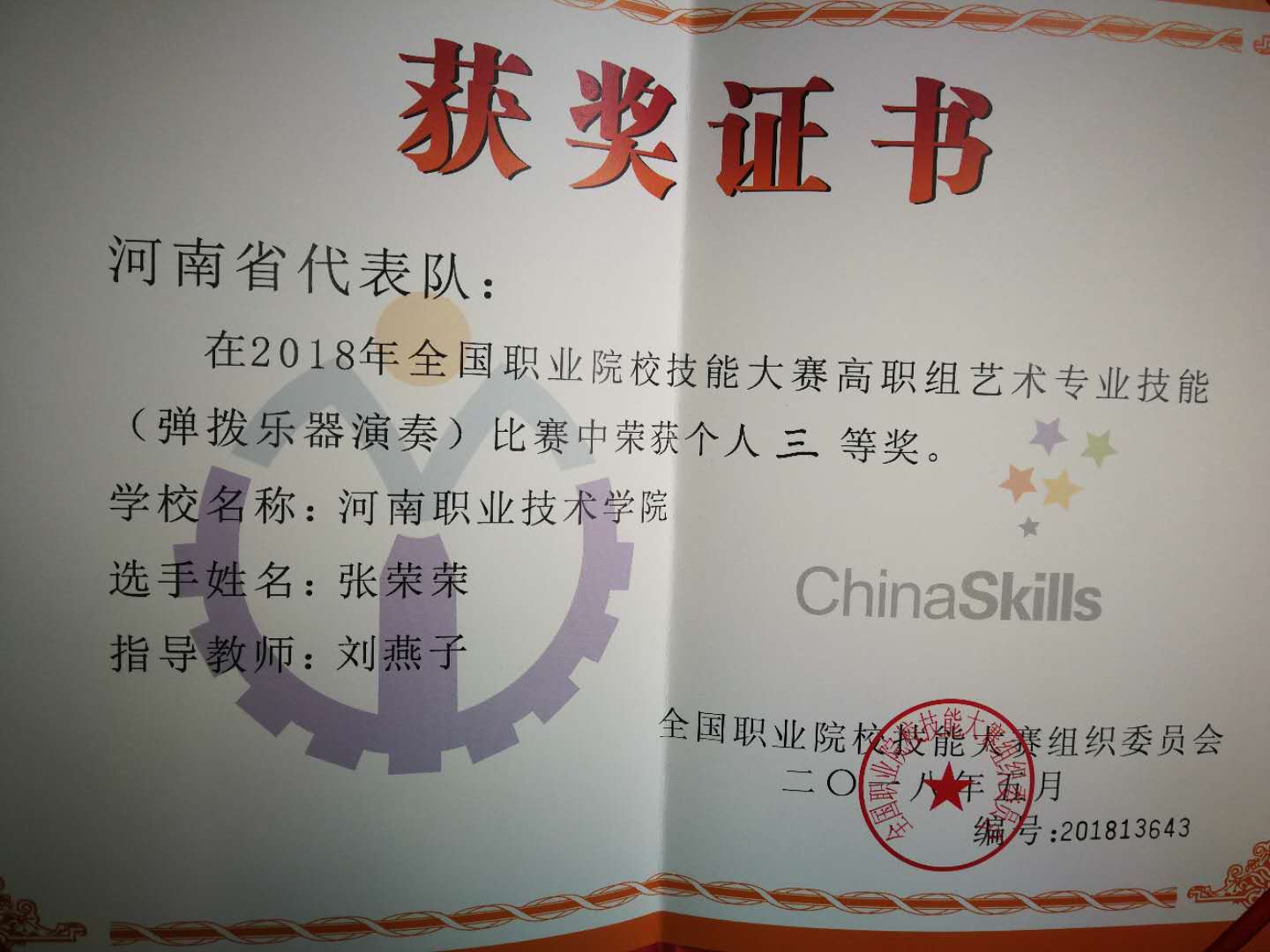 刚落幕的2018年全国职业院校弹拨乐器技能大赛中,太阳成集团122ccvip李晓乐、张荣荣两位选手分别荣获全国职业院校弹拨乐技能大赛高职组三等奖,公司也是河南省高职院校中唯一获得奖项的学校。