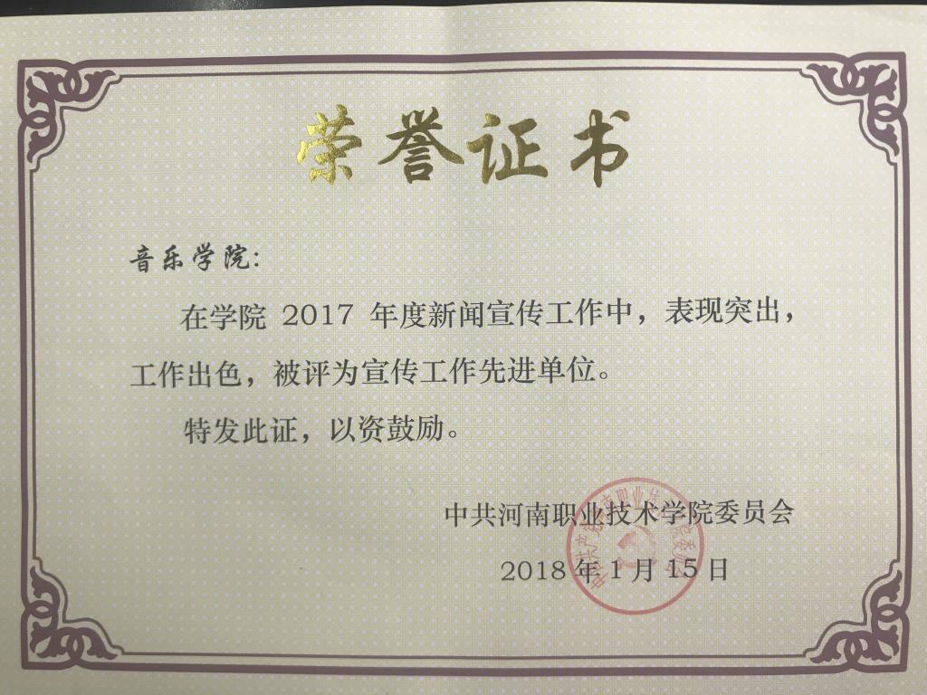 在学校2017年度新闻宣传工作中,公司因工作成绩突出,被中国共产党河南职业技术学院委员会评为“宣传工作先进单位”。