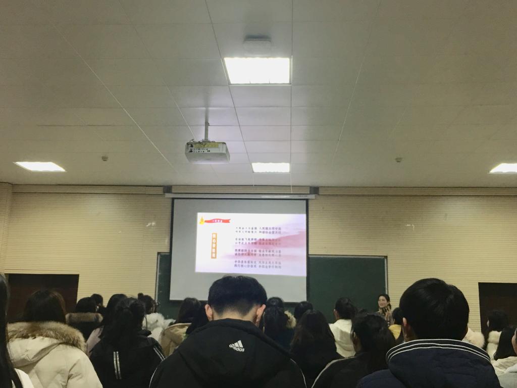 辅导员老师进行PPT展示,首先,分享了对于社会主义核心价值观的理解和感悟,带领大家学习了价值观的基本内容。其次,师生分别从法治、敬业、和谐等内容分享了自己的故事,从故事中领会价值观精神。最后,师生一起朗诵诗歌《社会主义核心价值观》,在嘹亮的朗诵声中结束了此次班会。