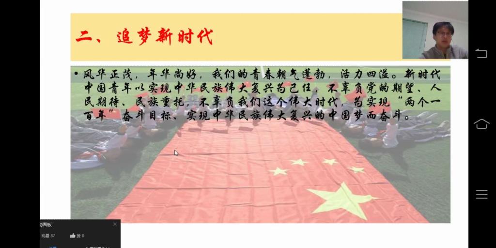在班会中,辅导员老师首先向大家介绍了“神七上天、北京奥运会、香港回归、澳门回归”等新中国成立以来取得的辉煌成就,并通过连麦由员工代表发言,结合当下疫情防控谈谈辉煌新中国。然后,辅导员老师就追梦新时代表达对当代青年老员工的期望和要求。