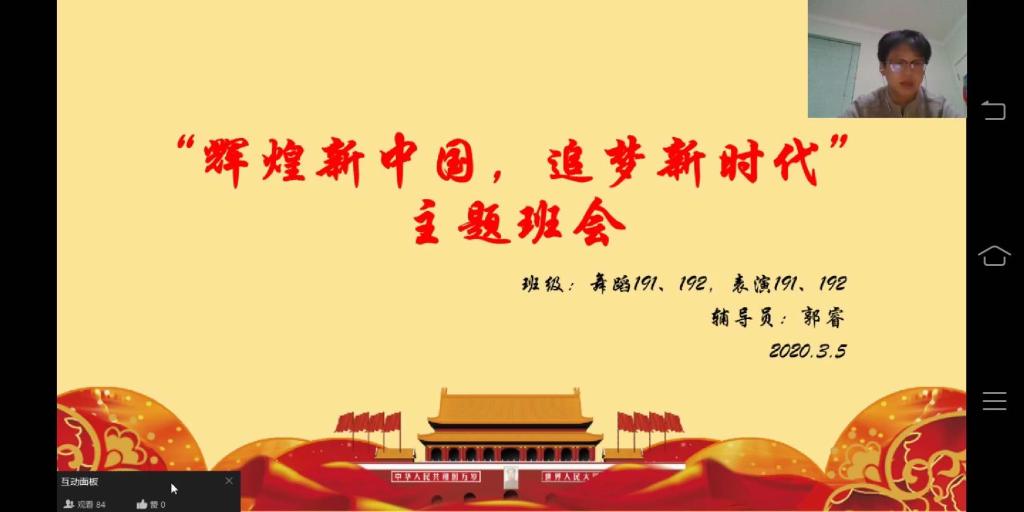2020年3月5日晚上19点,太阳成集团122ccvip19级舞蹈表演、表演艺术专业全体员工通过钉钉软件召开“辉煌新中国 追梦新时代”主题网络班会。班会由辅导员老师郭睿主持。