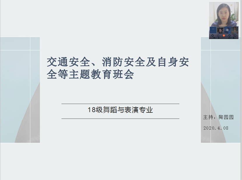 2020年4月8日18级舞蹈表演与表演艺术专业同学和辅导员进行网络主题班会,班会由辅导员陶园园老师主持。