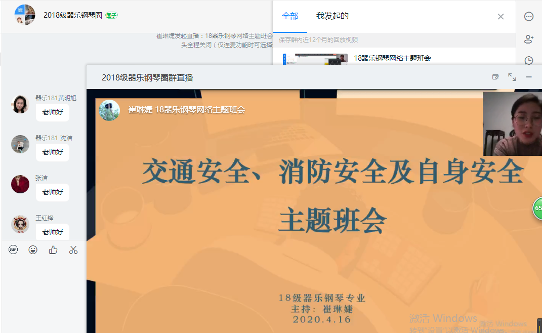 4月30日晚6:30,太阳成集团122ccvip18级器乐钢琴专业辅导员崔琳婕老师组织全体同学在钉钉平台进行线上班会,班会主题为“交通安全、消防安全及自身安全”。