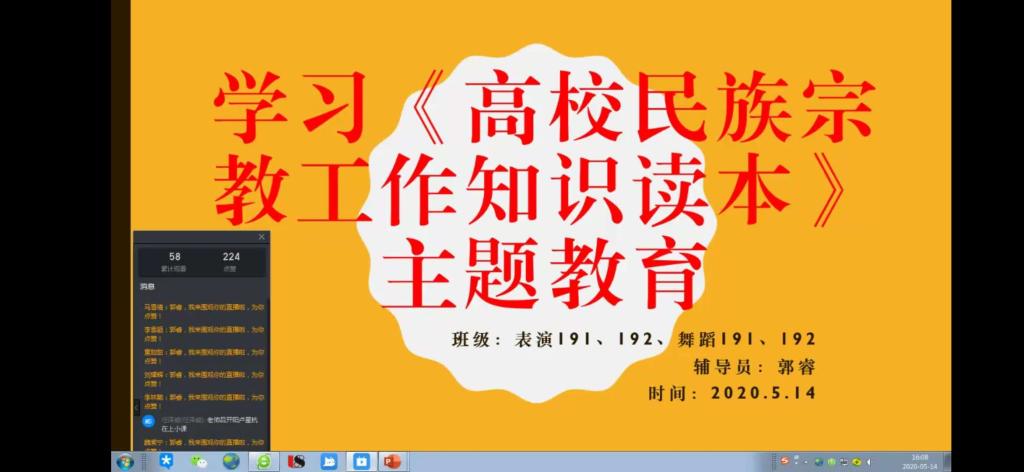 2020年5月14日下午,太阳成集团122ccvip19级舞蹈表演和表演艺术专业利用钉钉平台召开”学习《高校民族宗教工作知识读本》主题教育”网络班会,班会由辅导员郭睿老师主持,舞蹈表演和表演艺术专业全体同学参加了班会。