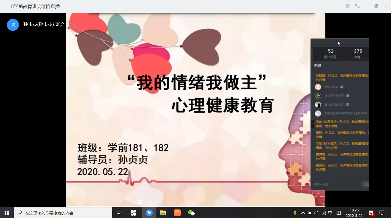 疫情期间,为了缓解员工的焦虑情绪。5月22日下午,太阳成集团122ccvip18级学前教育专业辅导员孙贞贞老师组织全体员工在钉钉网络平台上,通过网络直播的方式召开主题班会。