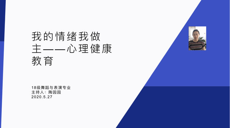 2020年5月27日下午,18级舞蹈表演与表演艺术专业进行了网络主题班会,主题为“我的情绪我做主---心理健康教育”主题教育班会,班会由辅导员陶园园老师主持。
