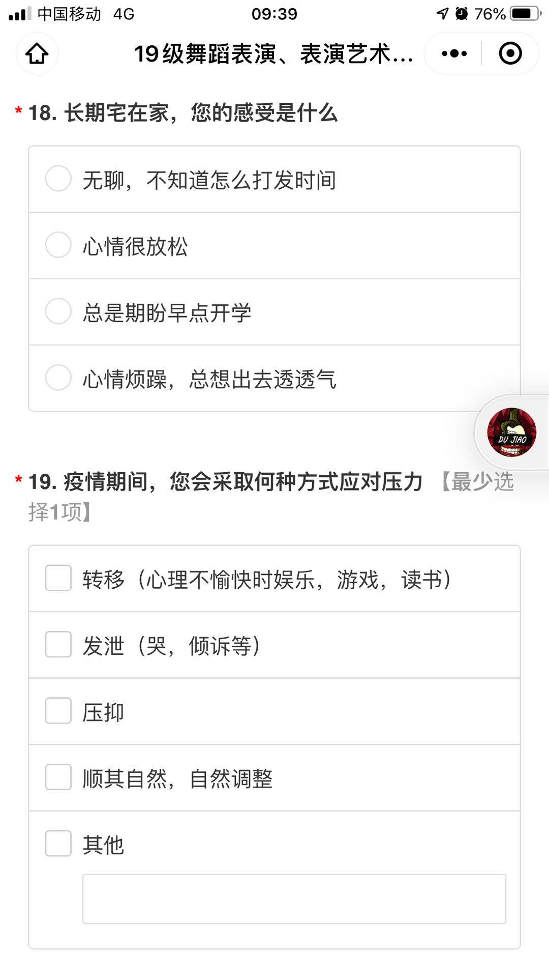 为了更好的了解疫情期间19级舞蹈表演、表演艺术专业员工心理健康状况,进而有针对性的做好心理健康教育工作。5月20日,辅导员老师郭睿利用问卷星平台制作了“疫情期间老员工心理健康状况”调查问卷向员工发布,95名同学全部完成。