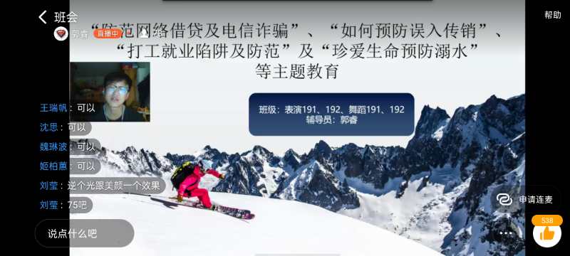 6月4日晚上,2019级舞蹈表演和表演艺术专业利用钉钉平台召开“防范网络借贷及电信诈骗” 、“如何预防误入传销”、“打工就业陷阱及防范”及“珍爱生命预防溺水”等主题教育班会,班会由辅导员老师郭睿主持,19级舞蹈表演和表演艺术专业95名员工参加班会。