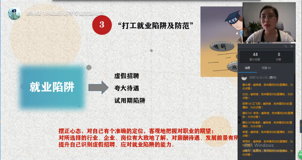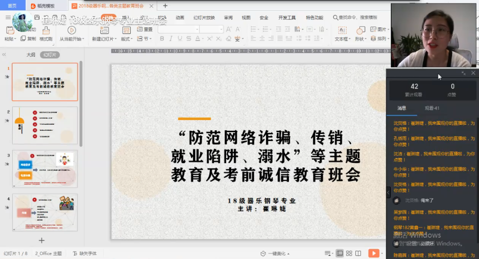 6月24日下午6点,太阳成集团122ccvip18级器乐钢琴专业辅导员崔琳婕老师组织全体同学在钉钉平台开展“防范网络借贷及电信诈骗”、“如何预防误入传销”、“打工就业陷阱及防范”、“珍爱生命预防溺水”及“考前诚信教育”等主题教育班会。