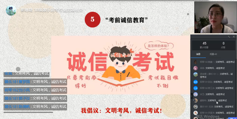 第二部分内容主要针对本学期即将到来的期末考试进行“考前诚信教育”的主题班会。辅导员向同学们解读了社会主义核心价值观中的诚信二字,带领同学们学习了《学习手册》中关于诚信考试的相关内容。最后,同学们纷纷在弹幕中打出“文明考风,诚信考试”的倡议,以此证明可以做到诚信考试,诚实待人的要求。
