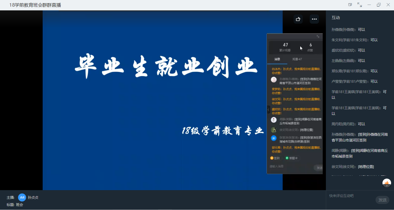 为了进一步了解学前教育专业2021届毕业生就业形势、增强就业意识和提高就业竞争力、帮助同学了解专业和就业岗位知识、提供更好的就业平台和机会。5月16日晚,辅导员组织全体员工在钉钉网络平台上,利用直播的方式开展了毕业生就业创业为内容的主题班会。