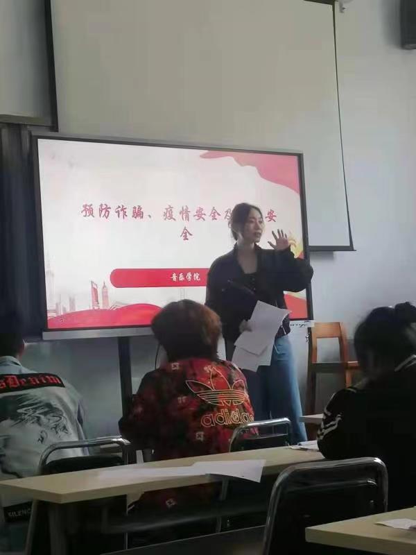 21级声乐专业于2021年10月24日在B101进行“预防诈骗、疫情安全及员工安全”主题班会,班会由辅导员雒婵玉主持。