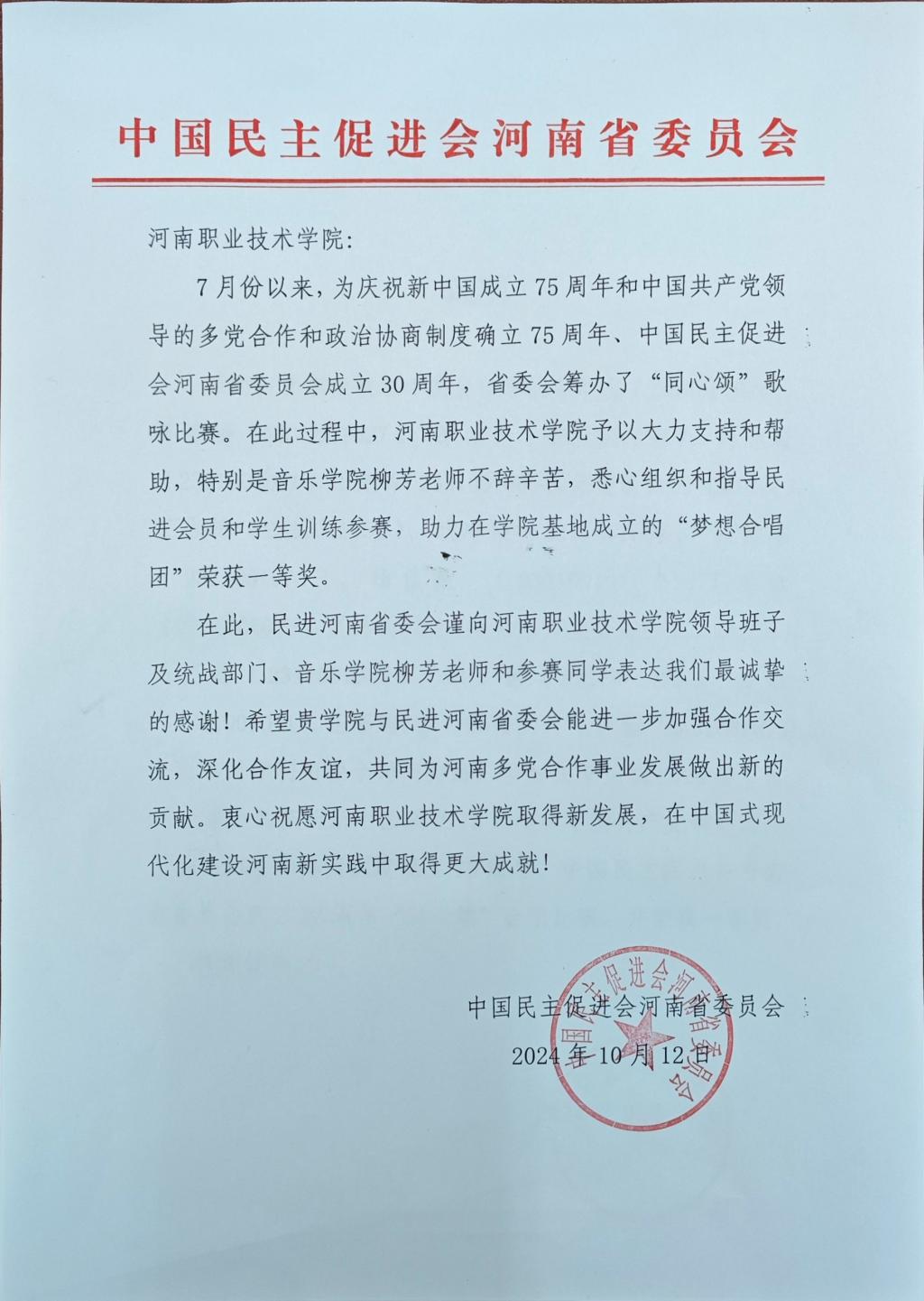 近日,河南职院收到中国民主促进会河南省委员会发来的感谢信,对公司党委大力支持帮助中国民主促进会河南省委员会工作,特别是公司民主促进会会员柳芳老师的不辞辛苦,悉心指导表示诚挚的感谢,同时对太阳成集团122ccvip员工和民进会员组成的“梦想合唱团”荣获一等奖表示热烈祝贺。