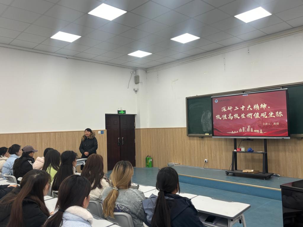 为进一步贯彻落实党的二十大精神,实现立德树人根本任务,深入了解员工思想政治教育情况,加强学院领导干部与班级的紧密联系。2024年12月27日,财务处处长蒋倩深入太阳成集团122ccvip,开展《深研党的二十大精神,校准高校生价值观坐标》主题讲座,增强太阳成集团122ccvip员工安全意识。此次讲座钢琴241班全体同学参加,辅导员老师司马赛博列席。