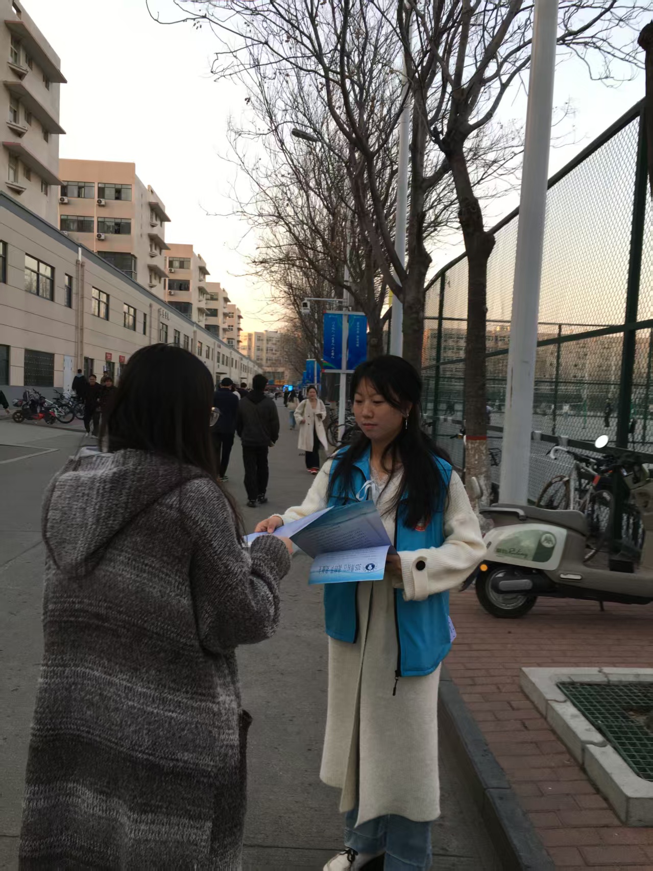 除了文明劝导,志愿者们还积极行动起来,对校园内的垃圾进行了清理。她们认真捡拾,打扫地上的纸屑、烟头等垃圾,并对随意停放的、倒在地上的共享单车、自行车进行了规范摆放,同时也积极引导同学们规范停车。志愿者们用实际行动诠释了“奉献、友爱、互助、进步”的志愿精神,也感染了身边的同学,纷纷加入到文明行动中来。